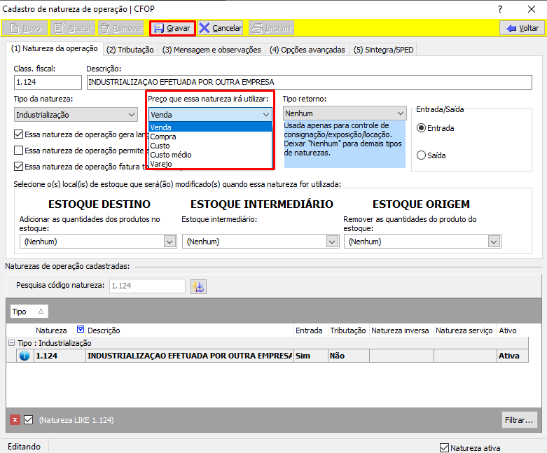 Para definir e verificar qual preço a Natureza de operação irá utilizar, devemos utilizar o Cadastro da Natureza de operação.