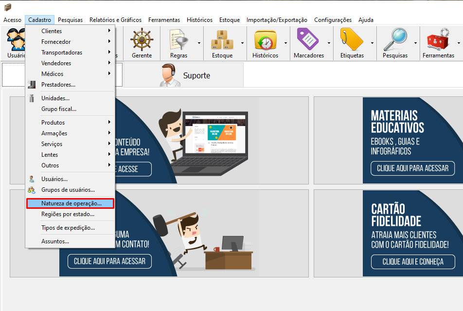 2. Clique em Cadastro - Natureza de operação...