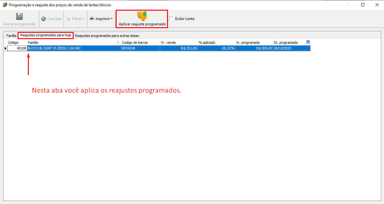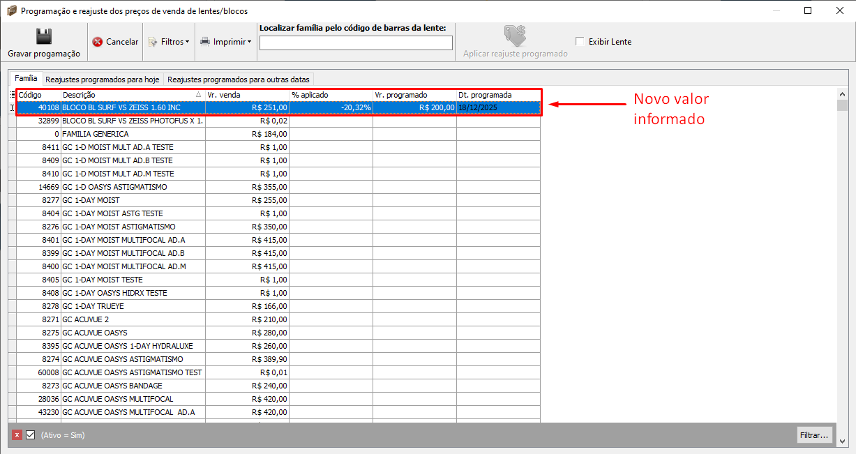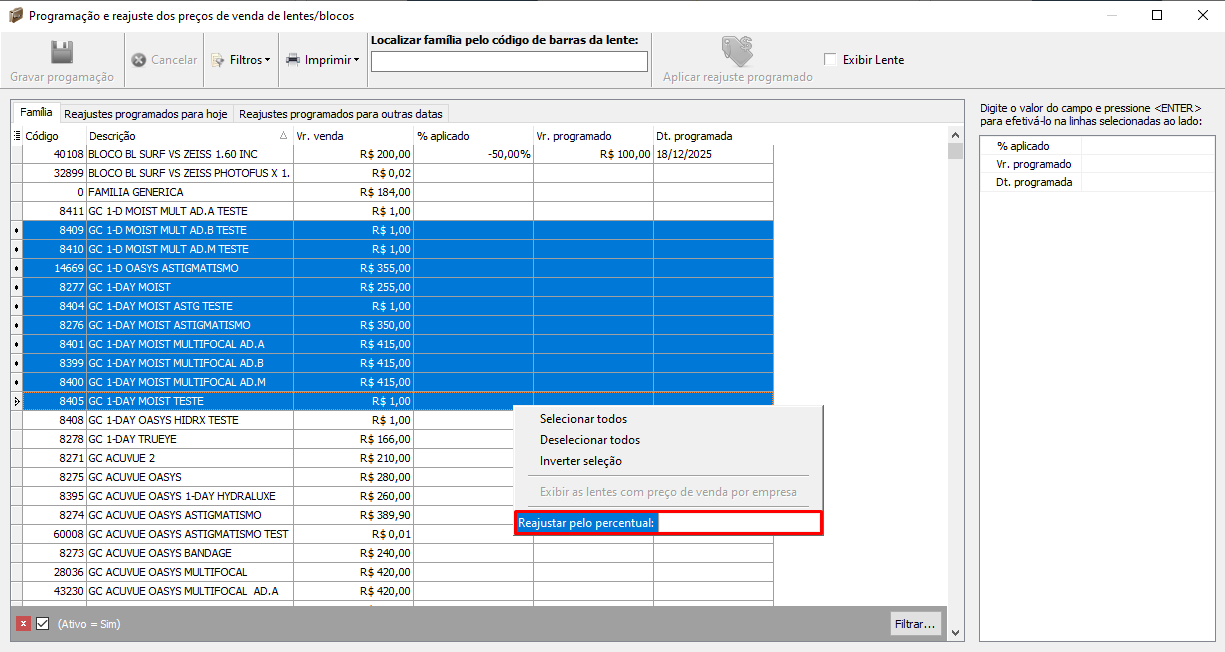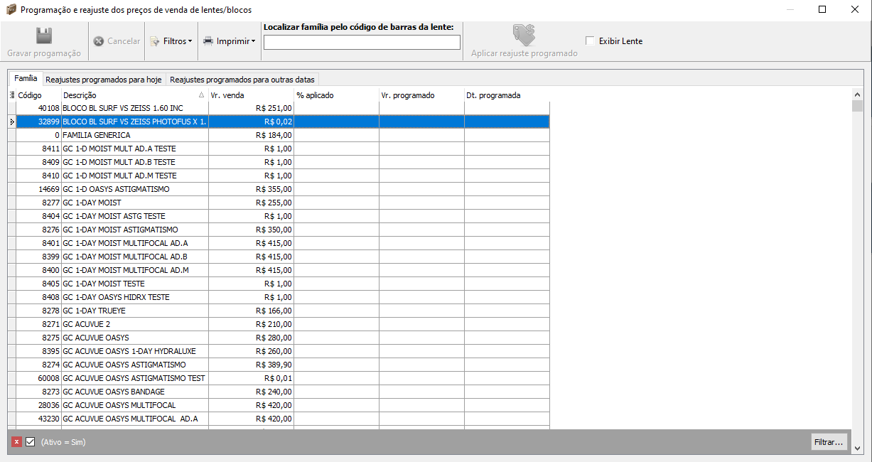 Após ajustar todas as Famílias conforme a necessidade, clique no botão Aplicar Reajuste Programado para que as alterações sejam aplicadas às Famílias de Lentes.