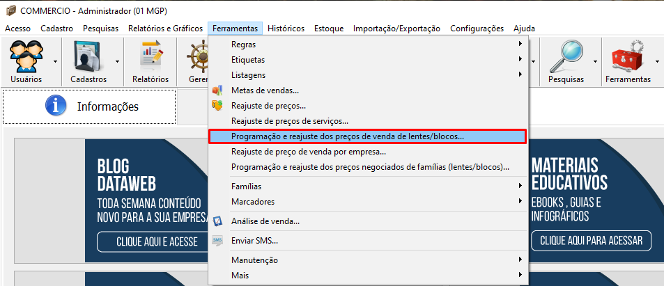 2. Será aberta a tela destinada ao ajuste do preço de venda das lentes..