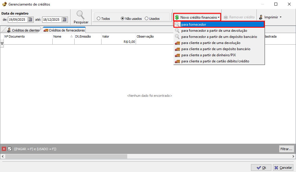 4. Será aberta a tela de Gerenciamento de Créditos. Clique em Novo Crédito Financeiro > Para Fornecedor.