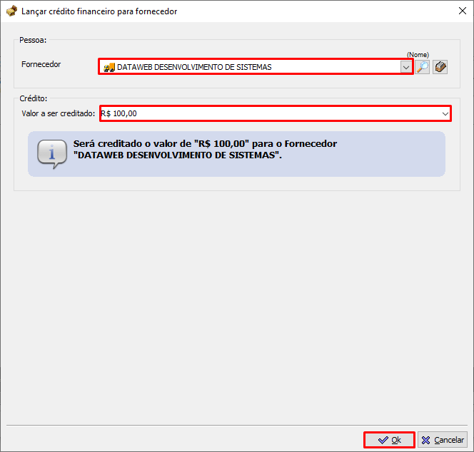 5. Localize o fornecedor desejado e preencha o valor a ser creditado ao mesmo.
