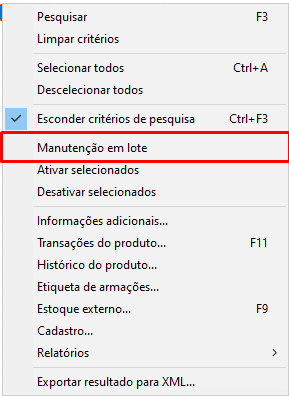 5. Após clicar com o botão direito vá em Manutenção em lote.