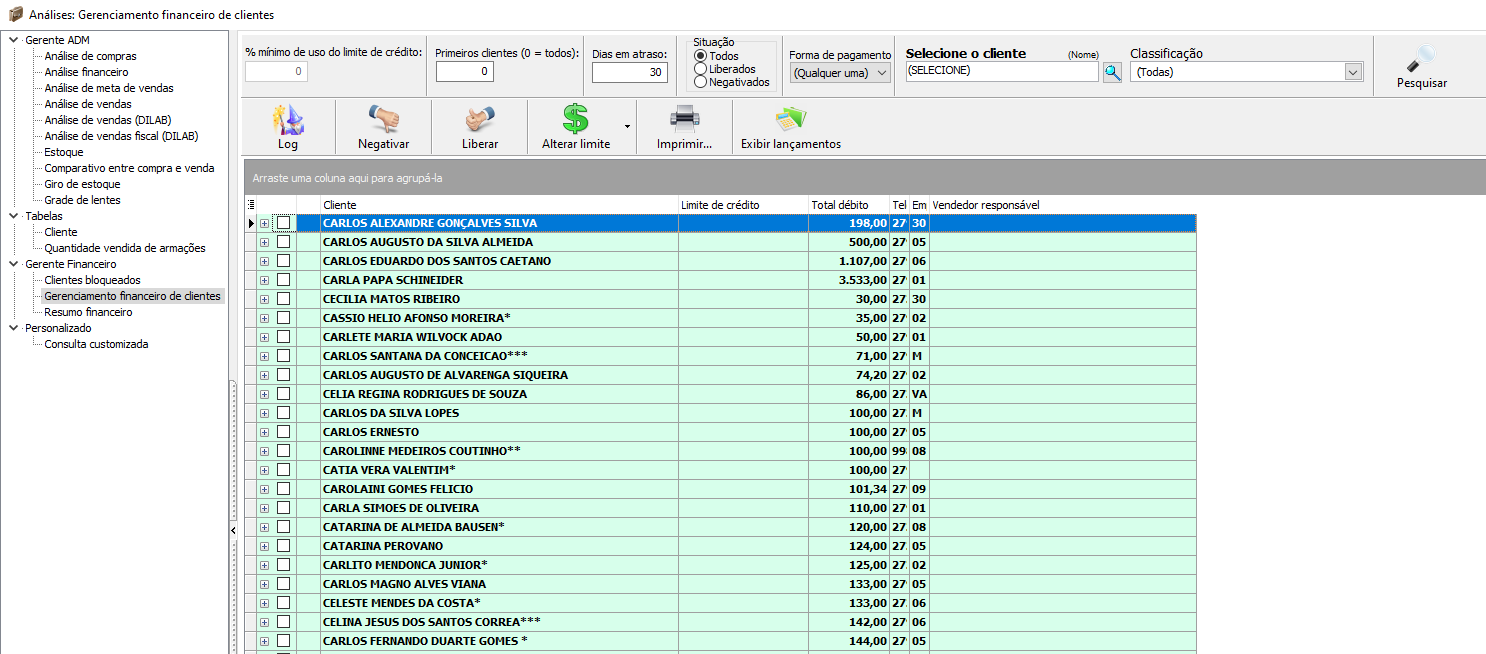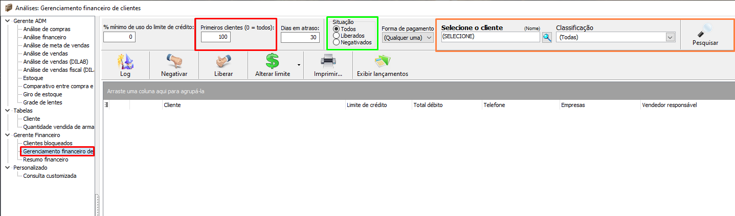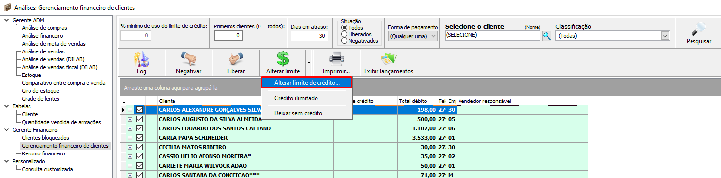Para alterar o limite de crédito de um ou mais clientes simultaneamente, utilize a ferramenta “Gerente Administrativo (Novo)”.