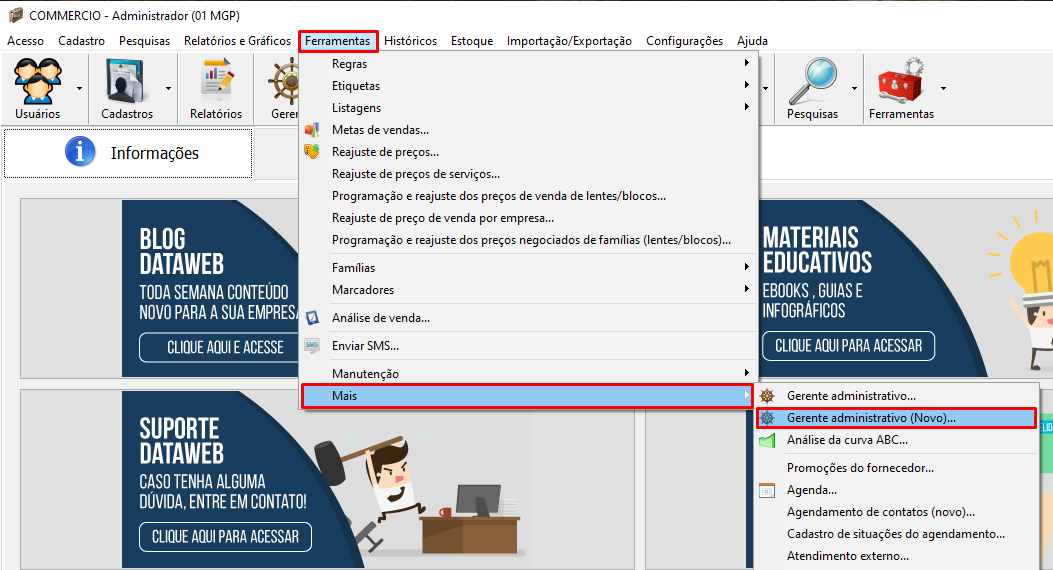 2. Ela pode ser acessada pelo botão disponível na tela inicial do módulo Administrador ou pelo menu Ferramentas > Mais > Gerente Administrativo (Novo).