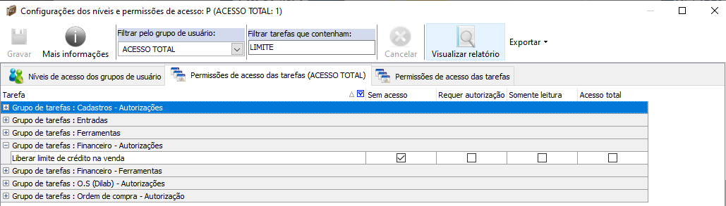 Para a ferramenta funcionar, precisa da seguinte permissão como Sem acesso ou Requer Autorização.