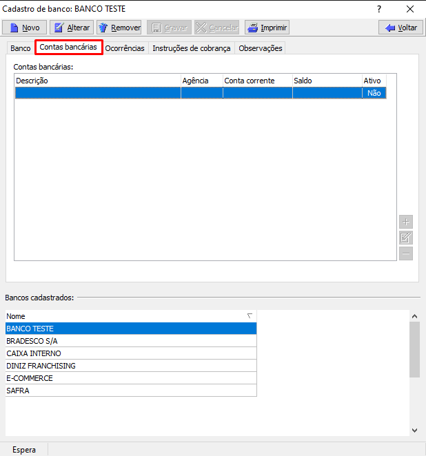 2. Selecione em qual Banco que será incluída a Conta e selecione a guia "Contas bancárias":