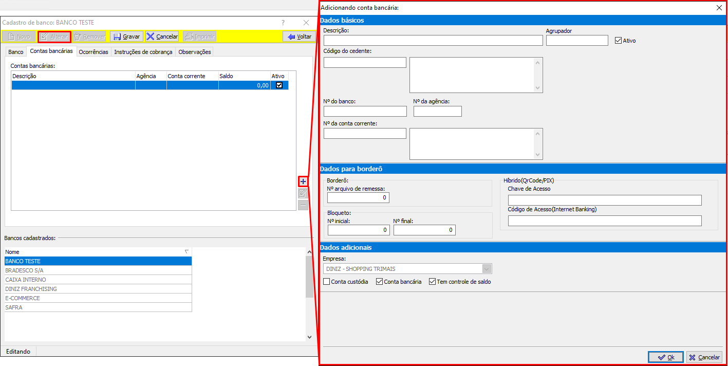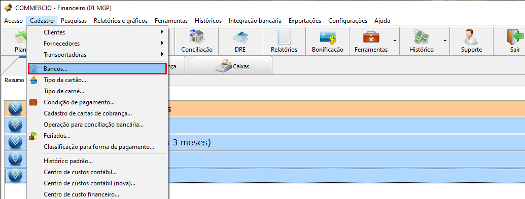 - Acessando o módulo financeiro, vamos cadastrar a conta bancária (Cadastros -> Bancos...)