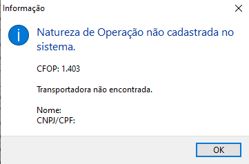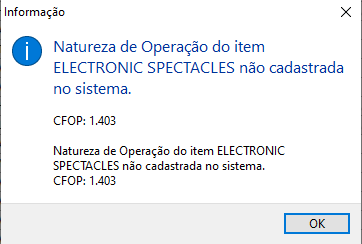 Mensagem de erro ao dar entrada de produto sem CFOP cadastrada.