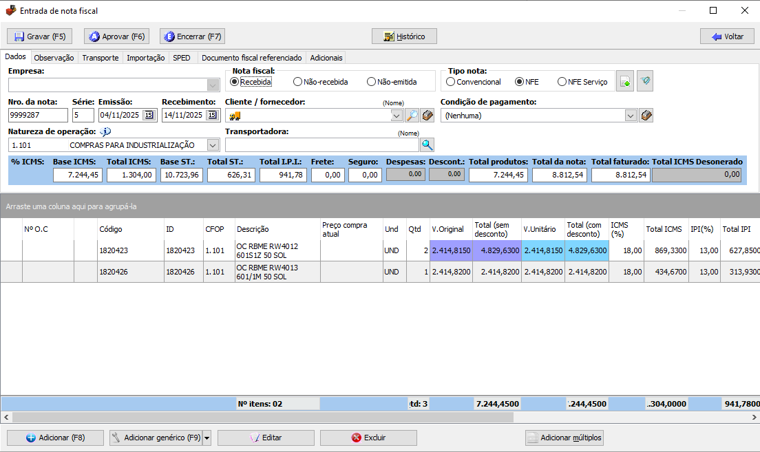 4° Após concluir a seleção das CFOPs nos produtos e confirmar com OK, o sistema abrirá a tela de encerramento do pedido, finalizando assim a entrada e inserindo os produtos no estoque da loja.
