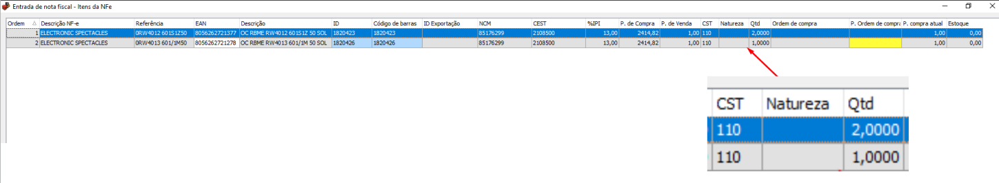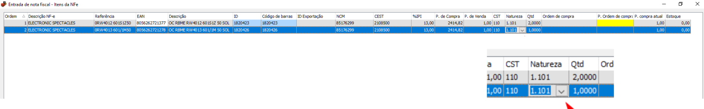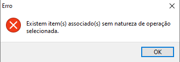 2° Ao clicar em nas duas mensagens, o sistema exibirá os produtos que estão sem natureza de operação, conforme mostrado na imagem abaixo.